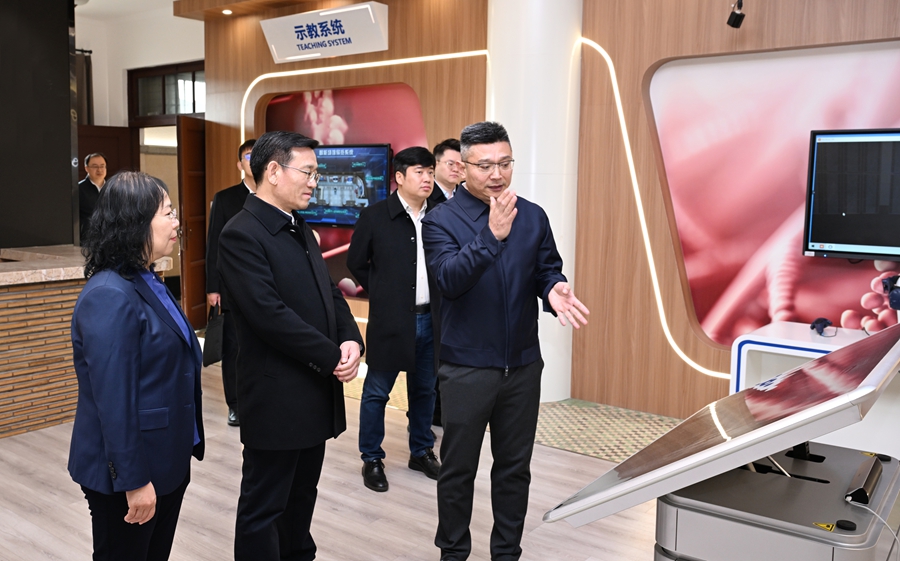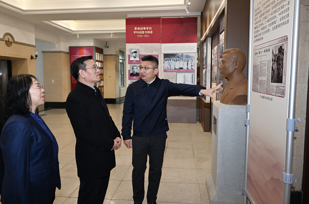 ,田辉调研了教育部医药基础研究创新中心实验室、病理生物学教育部重点实验室、动物实验中心及生物样本库等科研平台,实地察看平台建设情况,听取学院在学科建设、师资队伍、人才培养和科研创新等方面的汇报。在病理生物学教育部重点实验室标本陈列馆,他仔细察看馆藏标本和中国数字人解剖系统演示,强调要加强对珍贵教学科研资源的保护与利用。时值白求恩逝世86周年纪念日,田辉指出,要大力传承弘扬白求恩精神,面向国家重大战略需求,深化基础医学与临床医学交叉融合,加快科研成果转化与应用,努力建设具有国际影响力的医学创新高地。