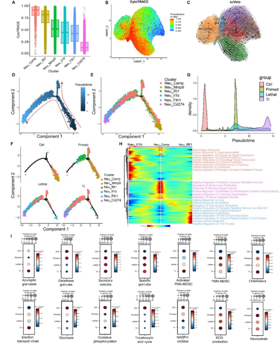 低剂量预刺激后,中性粒细胞相关炎症和抗菌通路被显著激活,Irf5是其中最突出的上调分子之一。单细胞转录组分析进一步揭示,在训练条件下,中性粒细胞更倾向分化为 Cd274⁺ 和 Fth1⁺ 两类终末状态,分别呈现免疫调节和ROS适应特征。