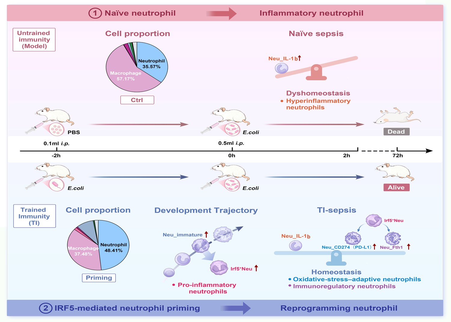 本研究首次发现,低剂量细菌预刺激中性粒细胞内Irf5信号激活,并使其在致死性二次感染中分化为Cd274⁺(免疫检查点富集)和Fth1⁺(ROS适应性)两个功能增强的终末亚群,显著提高细菌清除能力和宿主生存率。该机制在小鼠和斑马鱼中均适用,且对多种临床分离病原体具有广谱保护作用。该发现揭示了中性粒细胞“训练免疫”的细胞动力学规律,为开发宿主导向的抗感染治疗策略提供了全新靶点。
